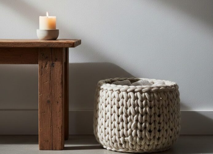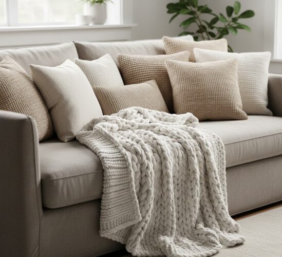 Η ζεστασιά έρχεται πάντα μέσα από την αφή. Ενσωματώστε το σε πολυτελή υφάσματα όπως χοντρά μάλλινα ριχτάρια, πλεκτές κουβέρτες, χνουδωτά μαξιλάρια από sherpa ή βελούδο. Τοποθετήστε ένα μεγάλο, αφράτο χαλί στην ίδια χρωματική παλέτα (από Cloud Dancer έως ανοιχτό μπεζ) στο σαλόνι για να δημιουργήσετε έναν πυρήνα ζεστασιάς κάτω από τα πόδια σας.