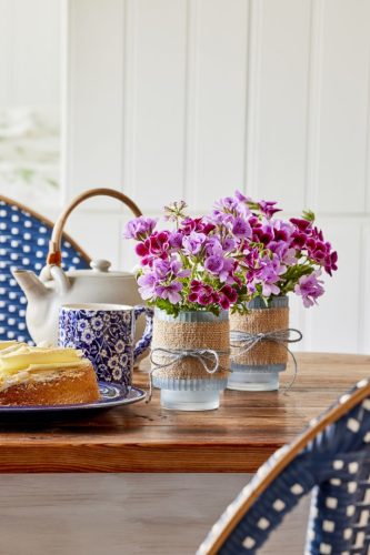 Από την άλλη, αυτή η όμορφη τραπεζαρία στα αριστερά είναι διακοσμημένη με λουλούδια από δύο διαφορετικά χρωματιστά γεράνια. Οι λωρίδες από σχοινί σιζάλ και ο μπλε σπάγκος δίνουν στα βάζα μια έξτρα φινέτσα.