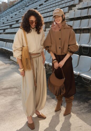 Οι suede τσάντες με κρόσσια τραβούν αμέσως το βλέμμα, ενώ οι maxi cuffs και οι statement ζώνες δίνουν ένταση στη σιλουέτα. Τα oversized γυαλιά ηλίου και τα sporty caps δημιουργούν μια ενδιαφέρουσα αντίθεση που κάνει το αποτέλεσμα ακόμη πιο σύγχρονο.