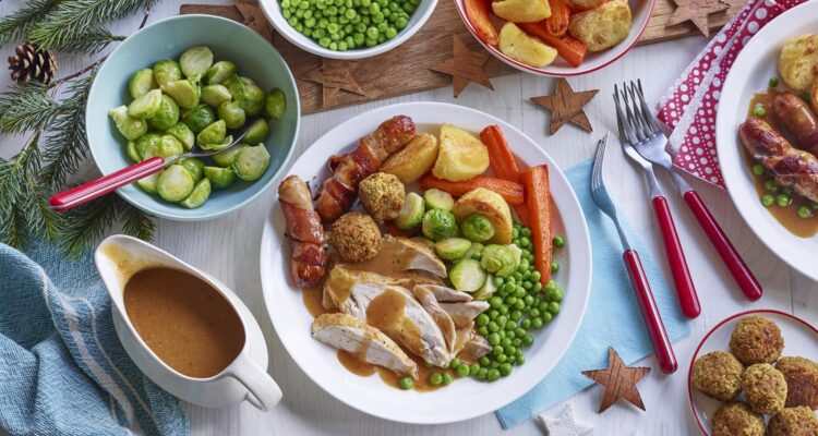 Κόψε το κοτόπουλο και σέρβιρε με τις τραγανές πατάτες, τα καρότα, τα λουκάνικα με μπέικον, τις μπαλίτσες γέμισης, τα λαχανάκια, τον αρακά και φυσικά το ζεστό gravy που τα ενώνει όλα.