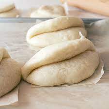 Βγάζουμε τη ζύμη σε μια καθαρή επιφάνεια και τη χτυπάμε μερικές φορές στον πάγκο. Την περνάμε από το baking powder και ζυμώνουμε για 5 λεπτά.