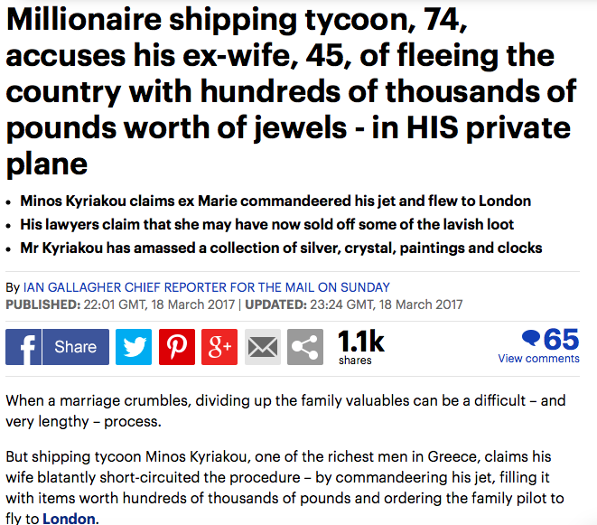 Σεισμικές δονήσεις προκάλεσε το δημοσίευμα της Daily Mail αφού αποκαλύπτει απίστευτες λεπτομέρειες για το διαζύγιο των Μίνωα και Μαρί Κυριακού! Ούτε λίγο ούτε πολύ υποστηρίζει πως ο πρώτος κατηγορεί την πρώην σύζυγό του “ότι εγκατέλειψε τη χώρα με κοσμήματα αξίας εκατοντάδων χιλιάδων λιρών χρησιμοποιώντας το προσωπικό του jet”!