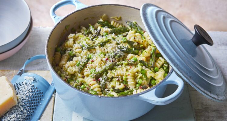 Αν θέλεις ένα πιάτο ανοιξιάτικο, ανάλαφρο και ταυτόχρονα χορταστικό, αυτή η μακαρονάδα με σπαράγγια και αρακά είναι πραγματικά ό,τι πρέπει. Η λεμονάτη κρέμα με παρμεζάνα δίνει φρεσκάδα και βελούδινη υφή, χωρίς να βαραίνει το αποτέλεσμα. Είναι μια συνταγή εύκολη, γρήγορη και πολύ πιο νόστιμη απ’ όσο ίσως περιμένεις από τόσο απλά υλικά.