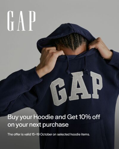 Και δεν σταματά εκεί. Για να τιμήσει αυτή τη μεγάλη επέτειο, η Gap προσφέρει κουπόνι έκπτωσης 10% για την επόμενη αγορά σου με κάθε hoodie που θα αγοράσεις στις 15 & 16 Οκτωβρίου, είτε πας στο κατάστημα είτε προτιμήσεις το eshop.