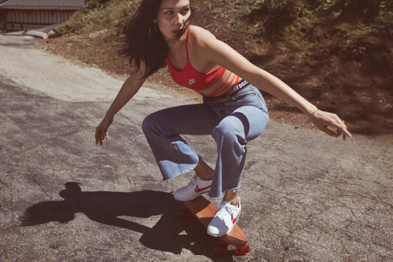 Ενόψει της επετείου των εμβληματικών Cortez, η Nike συνεργάζεται με το διεθνούς φήμης μοντέλο Bella Hadid, η οποία φωτογραφίζεται σαν άλλη Farrah Fawcett των 70s. Η Bella Hadid αναπαριστά την κλασσική φωτογραφία της γνωστής ηθοποιού, η οποία έκανε skateboard – κατά τη διάρκεια των γυρισμάτων μιας ταινίας – φορώντας τα θρυλικά αυτά παπούτσια.