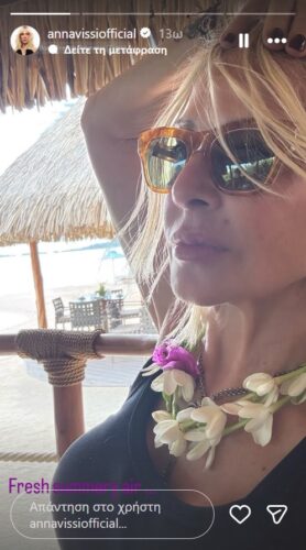 Στο story που δημοσίευσε στον προσωπικό της λογαριασμό στο Instagram την Τετάρτη 15 Απριλίου, η Άννα Βίσση ποζάρει με φόντο τη θάλασσα, φορώντας γυαλιά ηλίου και ένα εντυπωσιακό κολιέ από λουλούδια στον λαιμό. Στη λεζάντα της ανάρτησης έγραψε χαρακτηριστικά: «Φρέσκος καλοκαιρινός αέρας».