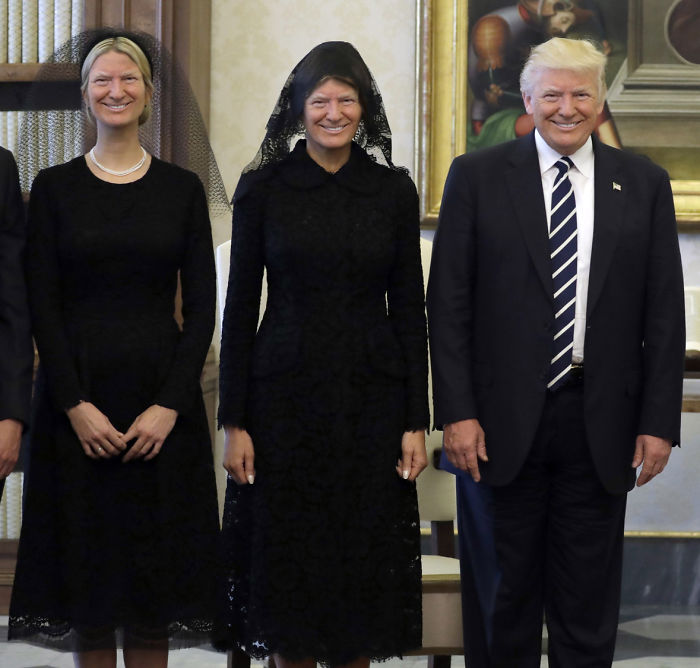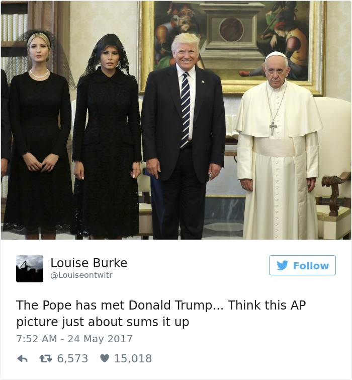 Οι γυναίκες μαυροντυμένες, ο Donald στον κόσμο του και ο Πάππας λες και δεν βλέπει την ώρα να εξαφανιστεί από εκεί που είναι. Το internet χρειάστηκε ελάχιστα λεπτά για να γεμίσει από τρομερές παραλλαγές της φωτογραφίας με απίστευτες ατάκες. Απολαύστε την ευρηματικότητα του κόσμου και όσο γιαα τον Πάππα του ευχόμαστε… ποτέ ξανά τέτοια δοκιμασία!