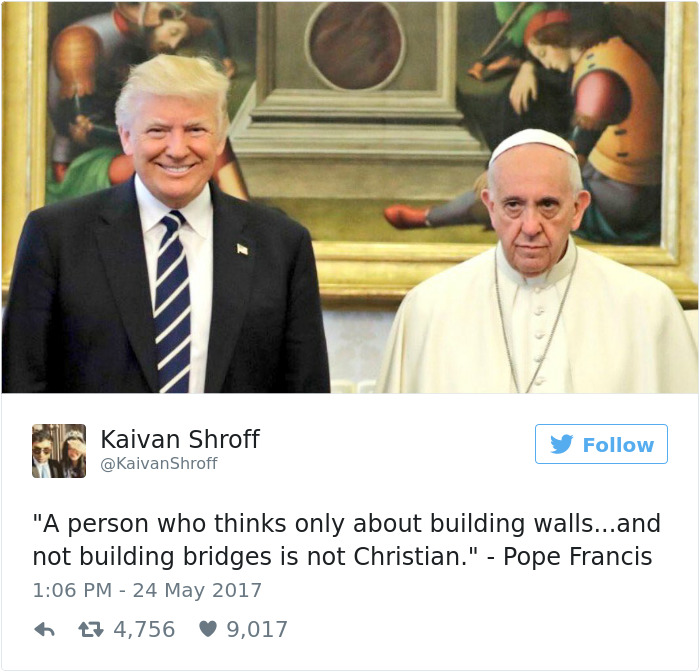 Ο Πάππας πρέπει να έζησε την πρώτη ημέρα στη ζωή του που δεν ήθελε με τίποτα να πάει στη “δουλειά”. Είχε έρθει η ώρα να συναντηθεί με τον Donald Trump, έναν άνθρωπο που έχει δηλώσει με έμμεσες δηλώσεις πως δεν εκτιμά καθόλου, και δυστυχώς αναγκάστηκε να πιει το πικρό αυτό ποτήρι. Η φωτογραφία που έβγαλαν ήταν ενδεικτική του κλίματος. Προσπαθούσε να γελάσει αλλά δεν του έβγαινε. Με τίποτε. Στήθηκε για τη φωτο και ιδού το αποτέλεσμα.