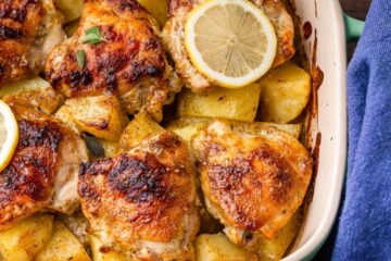 Ένα ταψί, ελάχιστη προετοιμασία, τέλειο αποτέλεσμα. Το κοτόπουλο γίνεται τραγανό απ’ έξω και τρυφερό μέσα, ενώ οι πατάτες απορροφούν τη λεμονάτη σάλτσα και λιώνουν στο στόμα.