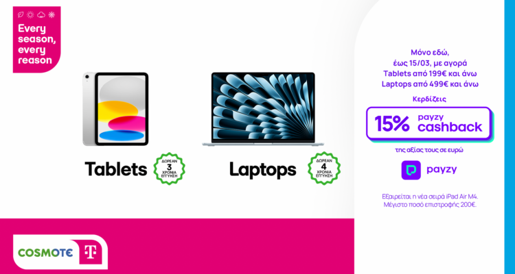 15% επιστροφή της αξίας των αγορών τους σε ευρώ (cashback) κερδίζουν οι καταναλωτές που θα αποκτήσουν tablet ή και laptop[1] με κάρτα payzy στα καταστήματα της COSMOTE TELEKOM και ΓΕΡΜΑΝΟΣ σε όλη την Ελλάδα, αλλά και στα cosmote.gr και germanos.gr. Η προσφορά ισχύει μέχρι και τις 15 Μαρτίου 2026, για κάθε αγορά tablet αξίας 199€ και άνω και laptop αξίας 499€ και άνω[2].