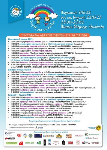 Μια γιορτή χαράς και παιχνιδιού για όλα τα παιδιά. Πολυάριθμες δημιουργικές δραστηριότητες, ταξίδια στο διάστημα, αφήγηση παραμυθιού, ρομποτική, προσκοπικά παιχνίδια, παραδοσιακοί χοροί, καραγκιόζης, booble show, face painting και mindgames, εικαστικά, θεατρικά και μουσικοκινητικά εργαστήρια, καθώς και πολλές εκπλήξεις περιμένουν τους μικρούς, αλλά και μεγάλους φίλους μας.
