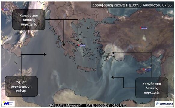 Χαμηλή είναι και σήμερα η ποιότητα του αέρα πάνω από τη χώρα μας και γενικότερα την Ανατολική Μεσόγειο εξαιτίας των πολλών πυρκαγιών στην περιοχή.