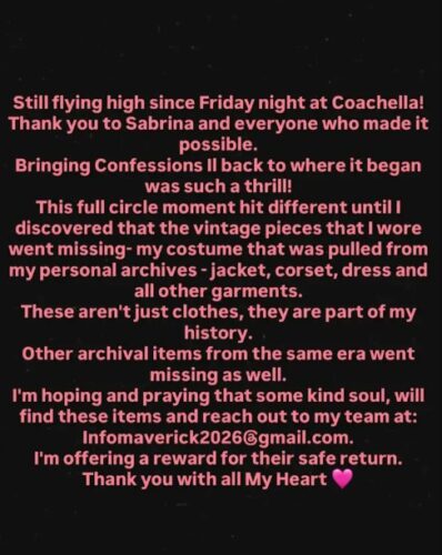 Κάπου ανάμεσα στη λάμψη, τα φώτα και τον ενθουσιασμό της βραδιάς, τα πράγματα πήραν μια περίεργη τροπή. Τα ρούχα απλά… εξαφανίστηκαν. Χωρίς ξεκάθαρες απαντήσεις για το πώς συνέβη, η ίδια στράφηκε στο Instagram, κάνοντας μια ανάρτηση που είχε κάτι από ευγνωμοσύνη αλλά και αρκετή απογοήτευση. Όπως έγραψε, αυτά τα κομμάτια δεν είναι απλώς ρούχα. Είναι μέρος της ιστορίας της. Και εδώ, δύσκολα μπορείς να διαφωνήσεις.