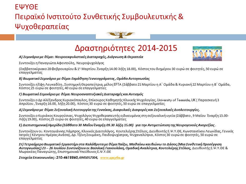 Τα σεμινάρια έχουν χαμηλό κόστος και διεξάγονται από έμπειρους κλινικούς με διεθνές κύρος που προσπαθούν να μεταδώσουν τις γνώσεις τους και την εμπειρία τους έχοντας κοινό γνώμονα την αγάπη για τον “άνθρωπο”. (Δήλωση συμμετοχών στο Facebook ή δήλωση ενδιαφέροντος στο www.epsythe.gr, ή κατευθείαν στα τηλέφωνα 210-4618860 & 6945057304).