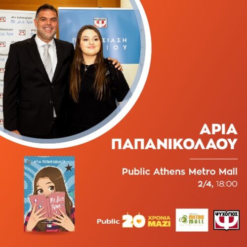 Με μεγάλη χαρά τα Public και οι εκδόσεις Ψυχογιός, σας προσκαλούν στην παρουσίαση του νέου βιβλίου της Άριας Παπανικολάου, «Με λένε Άρια» της Πέμπτη 2/4 στις 18:00 στο Public Metro Mall.
