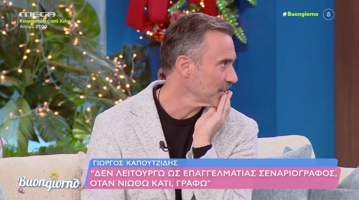 Καλεσμένος στην εκπομπή «Buongiorno», την Παρασκευή 19 Δεκεμβρίου, ο ηθοποιός και σεναριογράφος εξήγησε πως δεν αντιμετώπισε ποτέ τη γραφή με επαγγελματικούς όρους, αλλά ως μια βαθιά προσωπική διαδικασία. «Δεν λειτουργώ σαν ένας επαγγελματίας σεναριογράφος. Ένας επαγγελματίας σεναριογράφος δεν θα σταματούσε για να γράψει μετά από οκτώ χρόνια ξανά. Αυτό το οποίο έγραψα βγήκε μέσα από την καρδιά μου. Είναι η ζωή μου όλη, η ζωή που δεν έζησα. Η μοναχική μου εφηβεία που θα ήθελα να μην είναι μοναχική. Θα ήθελα να έχω παρέες και να μπαίνω σε περιπέτειες. Ήταν η ανάγκη μου να έχω μια παρέα. Την καρδιά μου σας έζησα. Αυτή την παρέα που δεν είχα την έφτιαξα να είναι στη δουλειά».