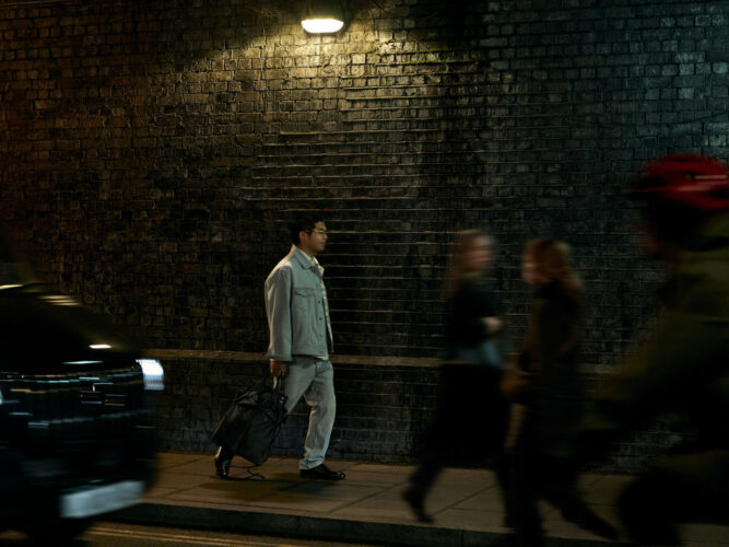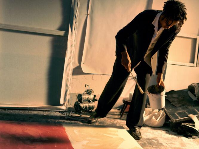 Στη ανδρική συλλογή, το πνεύμα της αυτοδημιουργίας εκφράζεται μέσα από ρετρό “resort” επιρροές, ‘φιλτραρισμένες’ μέσα από τον σύγχρονο, μητροπολιτικό φακό της HUGO. Ένα boxy double-breasted blazer φοριέται πάνω από πουκάμισο με Cuban γιακά, συνδυασμένο με ασορτί πλισέ παντελόνι και tote τσάντα με ταρταρούγα, δημιουργώντας ένα look ιδανικό για ημέρες που ξεκινούν με side hustle και καταλήγουν σε late-night meeting, χωρίς να χρειάζεται αλλαγή. Ένα μακρύ, double-breasted κοστούμι από υφασμάτινη πλέξη χαλαρώνει τους κανόνες της παραδοσιακής ραπτικής, αντικατοπτρίζοντας μια νέα μορφή φιλοδοξίας: λιγότερο boardroom, περισσότερο “build-your-own brief”.