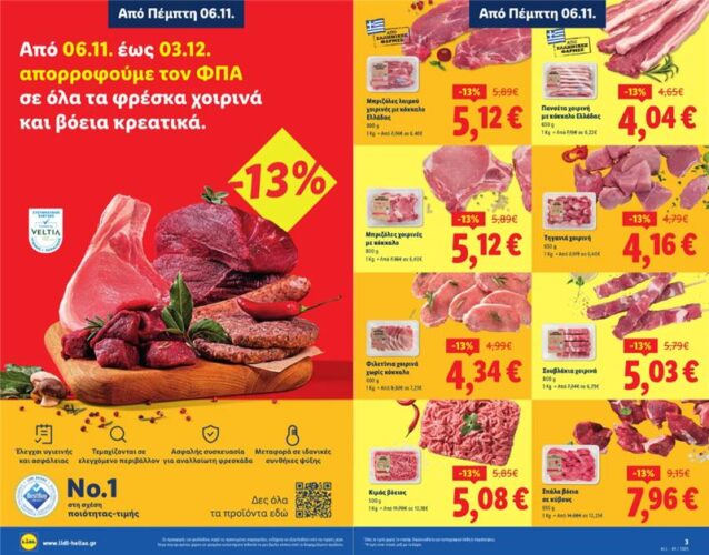 Με στόχο τη στήριξη των καταναλωτών και την ενίσχυση της προσβασιμότητας σε ποιοτικά προϊόντα, η Lidl Ελλάς προχωρά σε μία σημαντική πρωτοβουλία που καθιστά το φρέσκο κρέας ακόμη πιο προσιτό. Από τη Πέμπτη 6 Νοεμβρίου έως και την Τετάρτη 3 Δεκεμβρίου, η εταιρεία προχωρά στην απορρόφηση του Φόρου Προστιθέμενης Αξίας (ΦΠΑ) και προσφέρει όλα τα φρέσκα χοιρινά και βόεια κρεατικά με έκπτωση -13%, χωρίς καμία απολύτως έκπτωση ως προς την ποιότητα, τη γεύση και τη φρεσκάδα.