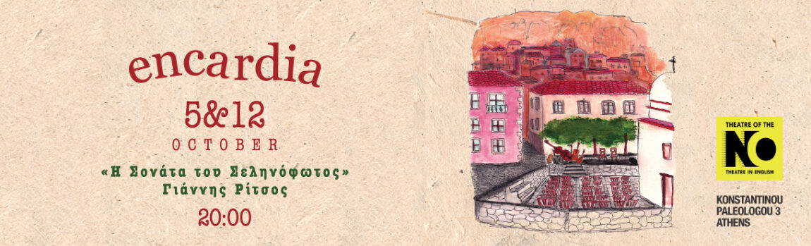 Το THEATRE OF THE NO υποδέχεται τους Encardia σε μια ξεχωριστή μουσικοθεατρική απόδοση της «Σονάτας του Σεληνόφωτος» του Γιάννη Ρίτσου. Η ποίηση και η μουσική ενώνονται για να δημιουργήσουν μια μοναδική εμπειρία, όπου οι στίχοι του Ρίτσου συνομιλούν με τη σύγχρονη δημιουργία του συγκροτήματος. Για δυο παραστάσεις την Κυριακή 5 και 12 Οκτωβρίου στις 20.00.