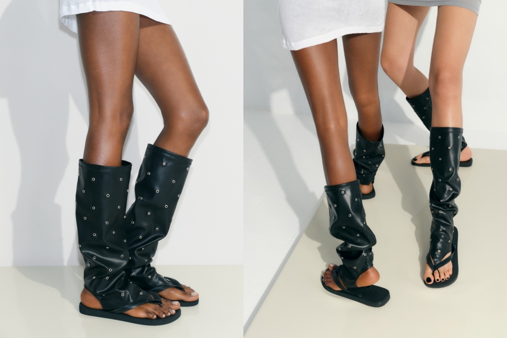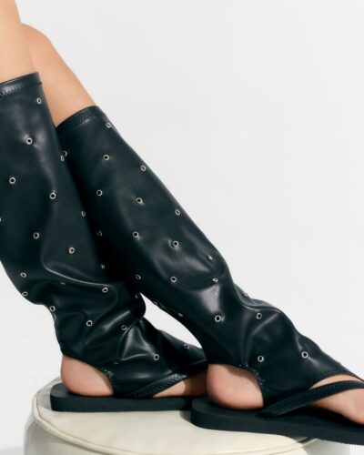 Το μαύρο Top συνδυάζεται με χειροποίητα δερμάτινα leg warmers της Gimaguas, αποκτώντας μια πιο refined, sophisticated αισθητική. Με μεταλλικές λεπτομέρειες – ένα χαρακτηριστικό του brand με έδρα τη Βαρκελώνη- το αξεσουάρ φοριέται εύκολα και αγκαλιάζει το πόδι και τα δάχτυλα. Μέσα από το παιχνίδι υφών, αντιθέσεων και όγκου, το design μεταμορφώνει τη χαρακτηριστική σιλουέτα της havaianas σε ένα transeasonal κομμάτι που φοριέται όλο τον χρόνο, μεταφέροντας το καλοκαιρινό mood σε νέες εποχές και περιστάσεις.